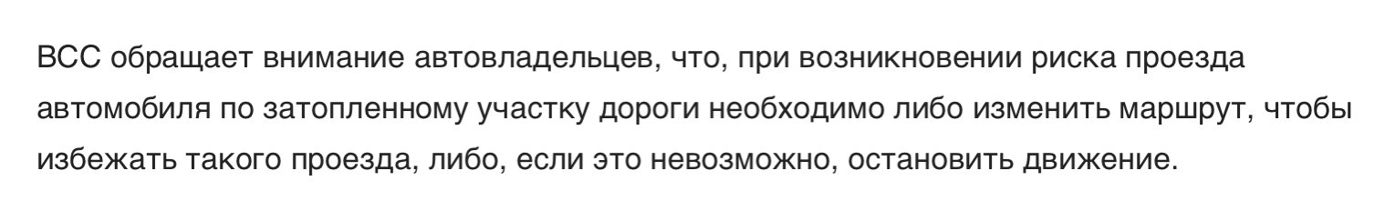 ВСС обращает внимание автовладельцев, что, при возникновении риска проезда автомобиля по затопленному участку дороги необходимо либо изменить маршрут, чтобы избежать такого проезда, либо, если это невозможно, остановить движение.