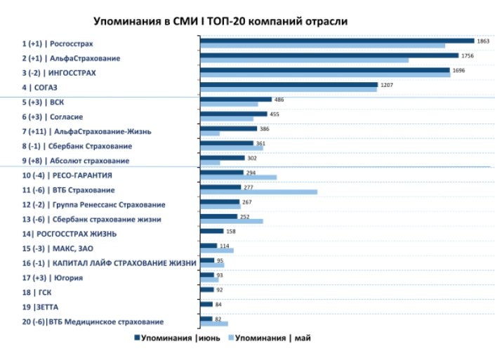По итогам июня 2019 г. тройка лидеров рейтинга страховых компаний осталась неизменной, однако «Росгосстрах» и «АльфаСтрахование» вытеснили «Ингосстрах», занимавшего два месяца подряд первое место. При этом объем упоминаний первых двух лидеров вырос: количество упоминаний «Росгосстраха» увеличилось на 12%, «АльфаСтрахования» — на 24%. «Ингосстрах» же показал незначительное падение.