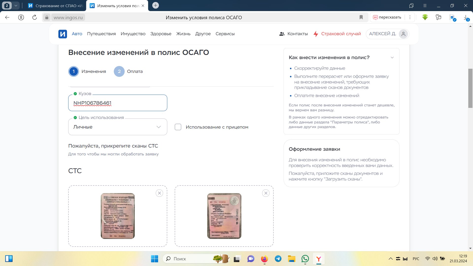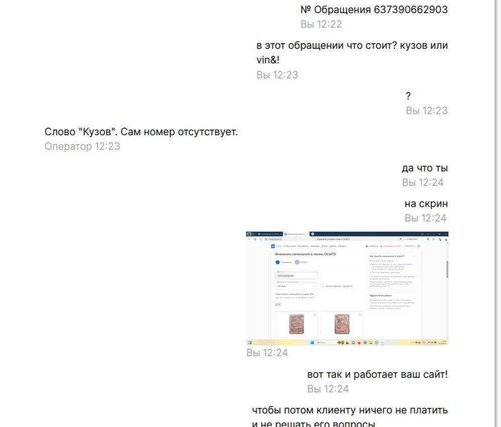 Пишу в поддержку, на что меня ваш НЕКОМПИТЕНТНЫЙ сотрудник уверяет, что я оформил заявку на VIN-КОД! Офирмите заявку заново, говорит она мне, спустя полу часа споров. Я захжу между делом опять в полис-внести изменения. Открываю блок с ТС, где уже горит КРАСНЫМ тот самый VIN-КОД (скрины прекреплю). Я опять пишу вашему оператору Алёне время по мск 12.13 21.03.2024, что я как клиент, чисто физически не впишу VIN-КОД, тк уже горит это окно красным и написано, что код должен содержать 17 знаков, ну а как мы все знаем, что в японках КУЗОВ и там меньше знаков. И говорю, ей, что это сделали ваши сотрудники, она меня опять обвиняя в клевете, говорит, что это я так отравил. Я примерно в 12.19 оформляю новое обращение. Захожу во внесение изменений, раздел ТС, переключаясь с горящего красным Vin на кузов и о, чудеса, написан кузов с одной N, но в РСА указан вин и кузов с ошибкой. Отавляю верно вписанный кузов, грузу опять документы. Обращение оформлено, пишу следом 12.21 вашему НЕДООПЕРАТОРУ, с вопросом, что там указано, снова вин или всё таки кузов? На что поступает ответ, что там вообще пусто! Я скинул специально скрин в чат, я зафиксировал, что это был кузов и он вписан в заявку! Занавес! Жалоба на ваши сотрудников оформлена, которую ждать месяц 637390699603. И опять жду кота в мешке! Весь диалог зафиксирован, диалог скачан. Сейчас напишу еще жалобу в ЦБ, как работает сайт Ингосстраха и его некомпитентные операторы, которые не понимают, что В ГРАФУ VIN Я НЕ ВПИХНУ НОМЕР КУЗОВА ИЗ-ЗА ОГРАНИЧЕНИЯ В ЗНАКАХ, ПРОГРАММА МНЕ НЕ ДАСТ ОФОРМИТЬ ЗАЯВКУ! И НЕВНИМАТЕЛЬНО РАБОТАЮТ СОТРУДНИКИ!