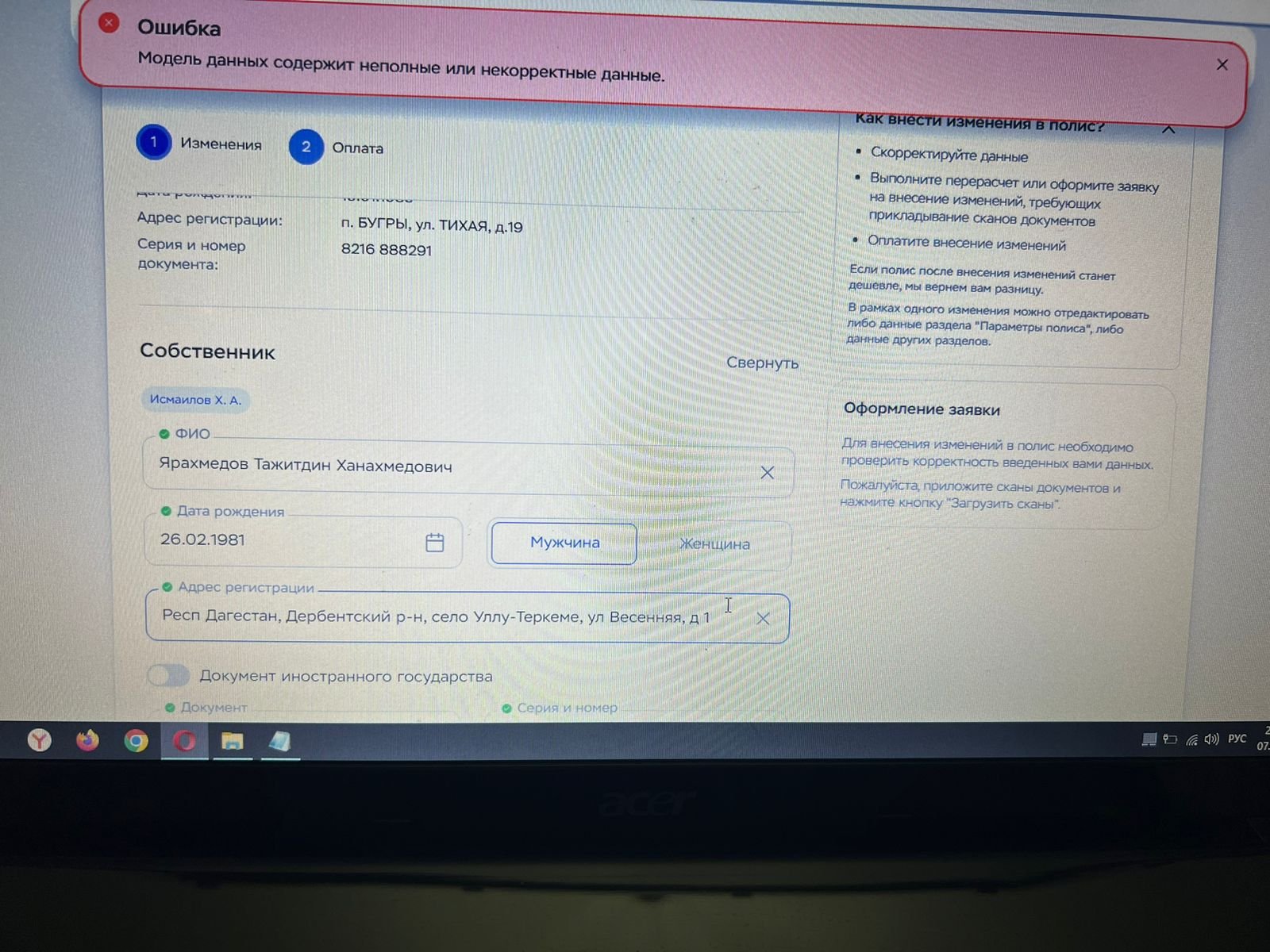 ПРОШУ ВАС ПРИНЯТЬ МЕРЫ ПО ИСПРАВЛЕНИЮ ОШИБКИ В ВАШЕЙ БАЗЕ. НЕ МОГУ 3 СУТКИ ЗАМЕНИТЬ СОБСТВЕННИКА ПРИЧИНА НЕ ВЕРНЫЕ ДАННЫЕ ТС Я КУПИЛ АВТО ХОТЕЛ ОФОРМИТЬ В ГАИ НА СЕБЯ НО НЕ СМОГ ТАК КАК ТЮНИНГ А СЕЙЧАС ХОЧУ ЗАМЕНИТЬ СОБСТВЕННИКА НО ВАША КОМПАНИЯ МНЕ ЭТОГО НЕ ПОЗВОЛЯЕТ! ПРИМИТЕ МЕРЫ Я ПРИЛОЖИЛ ФОТО ОШИБКИ
