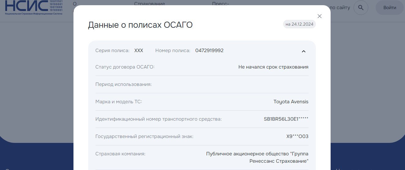 В НСИС вообще самый первый оформленный полис, прямо чудеса какие-то, у этого полиса не начался срок страхования, хотя срок страхования начался 30.11.2024
