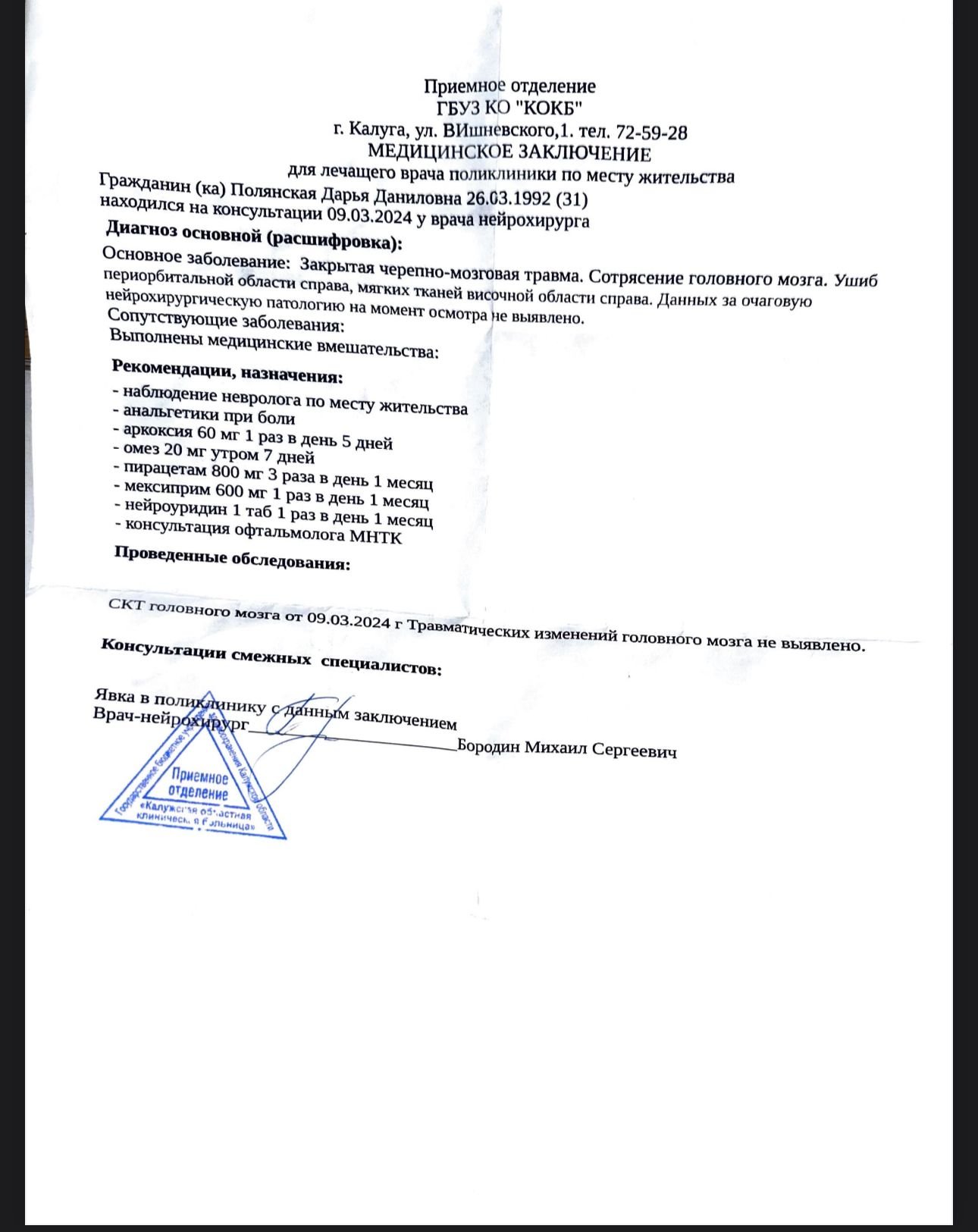 Добрый день, в марте месяце попала в ДТП с Яндекс-Такси, после ДТП забрала скорая так как была травма головы (сотрясение головного мозга), ушиб глазного яблока, коньюктевитное кровоизлияние двух глазных яблок, изменение зрачка… В общем пострадала достаточно серьезно!