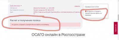 Не отправляются прикреплённые документы на проверку! Раньше всё нормально было, оформляли всем родственникам полисы на сайте. Сейчас же в самом конце, после прикрепления фотографий документов выскакивает надпись, что невозможно отправить их на проверку. Было проделано куча попыток, а толку-нуль.