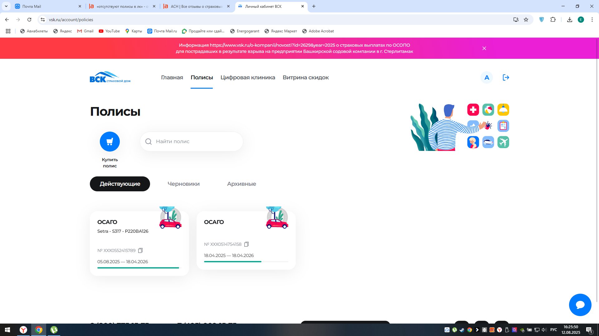 с 1 августа пишу на все адреса тп чтоб в личный кабинет добавили мои полисы ххх0514754158, ххх0549835010 номер телефона тот же эл. почта при регистрации изначальна та же зашел в личный кабинет полисов нет, тех поддержка отписка пишет что типо проверьте данные, отправил им уже и паспорт номера полисов. ответа нет, обращался в чат они меня мягко послали и сказали что не имеют понятия куда делись мои полюса