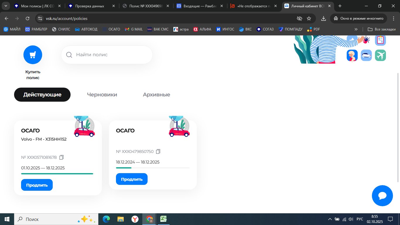 01.10.2025 страховая ВСК без каких либо объяснений удалила мой личный кабинет вместе со вторым полисом, который на мое удивление, отображался.