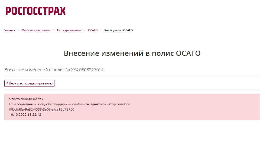 Очень интересная ситуация произошла с Росгосстрах. Молодого водителя через личный кабинет вписать оказалось не простой задачей. Еще летом хотели вписать, но на тот момент сумма, которую показал Росгосстрах в личном кабинете показалась слишком большой и решили повременить. Сейчас стало необходимым вписать сына в полис ОСАГО ХХХ 0508227012 и начала появляться постоянно ошибка с текстом «Что-то пошло не так.