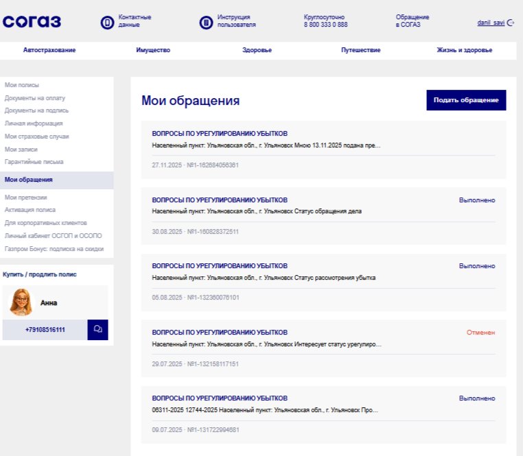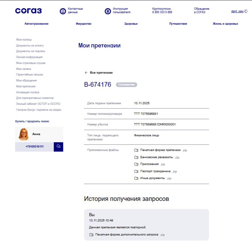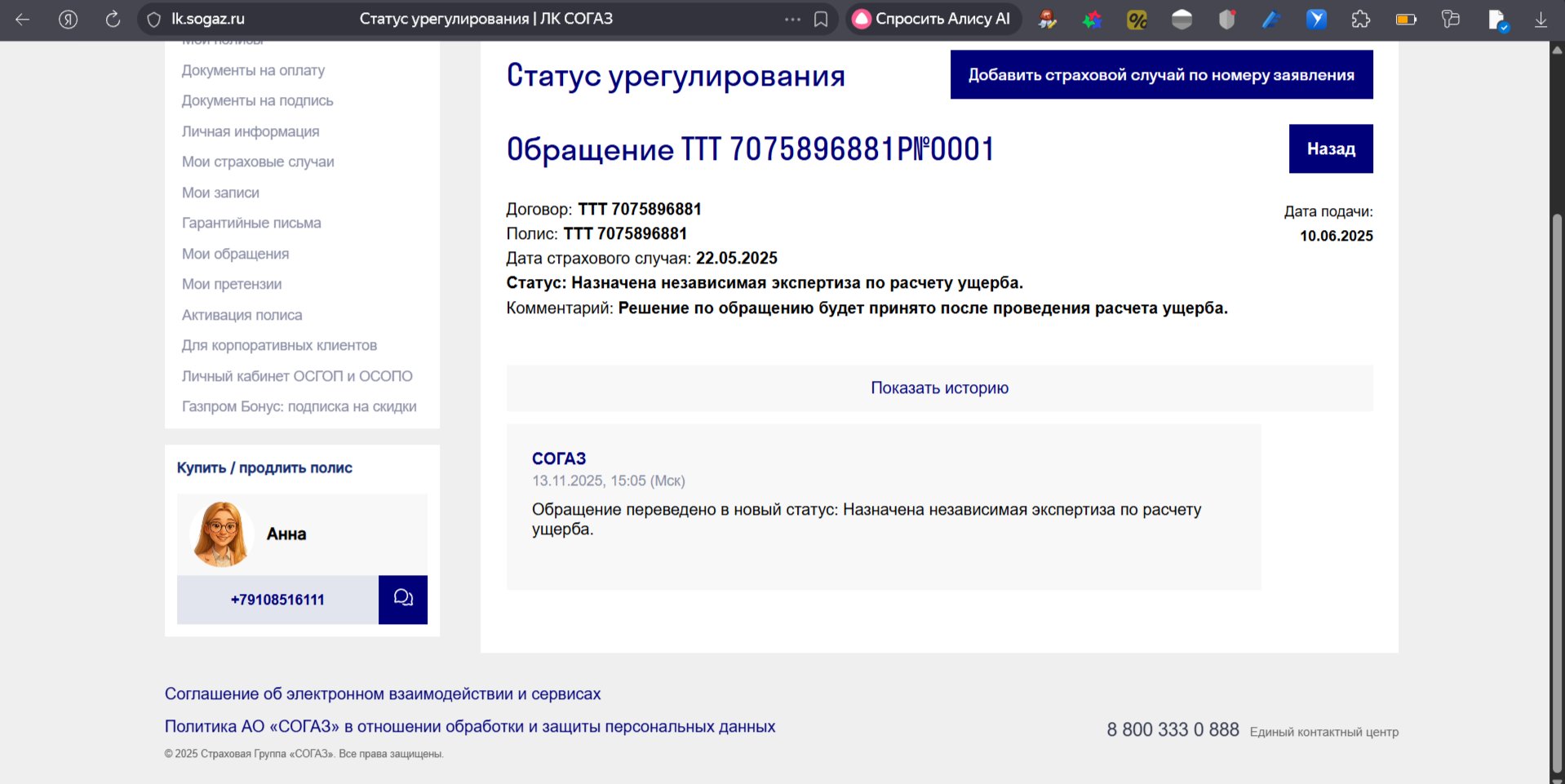 Мосле многочисленных жалоб через личный кабинет https://lk.sogaz.r..., 13.11.2025 мною подана претензия об урегулировании заявленного события ДТП.
