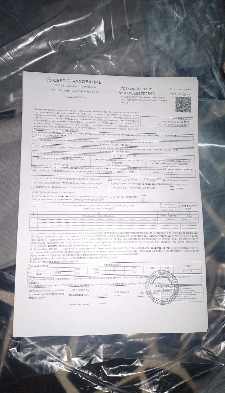 23 ноября 2025 года случайно обнаружил, что у меня закончился полис ОСАГО. Я находился в сельской местности далеко от различных офисов страховых компаний. Решил попробовать оформить полис ОСАГО онлайн. Мой выбор пал на сберстрахование. Зайдя в приложение сбера быстро нашёл в сервисах пункт сберстрахование, а в нём ОСАГО, ввёл номер автомобиля, а дальше вся информация появилась сама, осталось только всё сверить и оплатить полис. Перед этим я выбрал дату начала действия полиса 25.11.2025, порадовала цена 2718 рублей для автомобиля мощностью 105 лошадиных сил. Страховой полис ОСАГО номер ХХХ0588702898