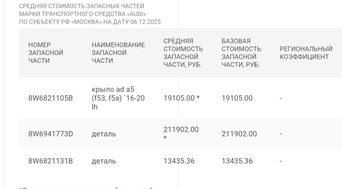Для понимание приведу стоимость запасных частей из базы РСА: