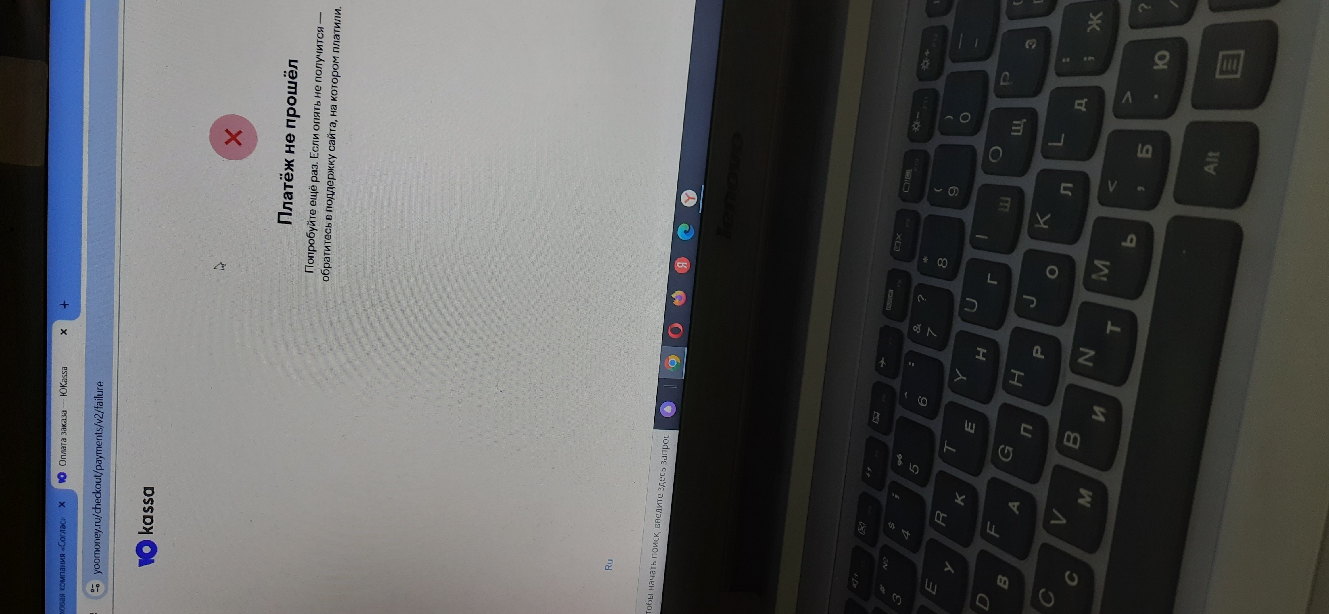 Дополню, что при клике на оплату выходит одно и тоже окно с логотипом ЮКасса: ПЛАТЁЖ НЕ ПРОШЁЛ. ПОПРОБУЙТЕ ЕЩЕ РАЗ. ЕСЛИ ОПЯТЬ НЕ ПОЛУЧИТСЯ — ОБРАТИТЕСЬ В ПОДДЕРЖКУ САЙТА НА КОТОРОМ ПЛАТИЛИ.