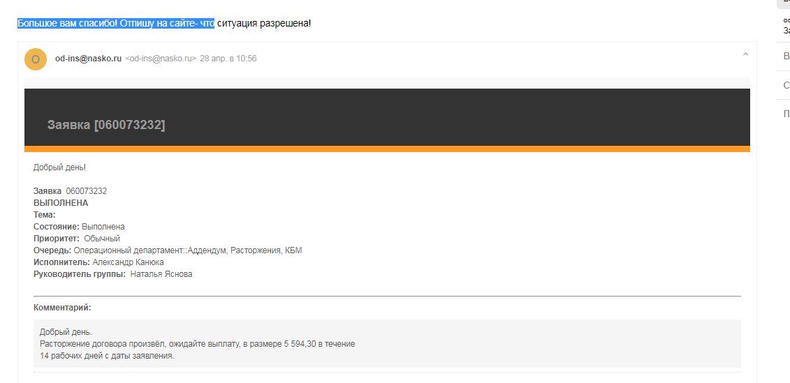 16.042018 г. мне выпала удивительная возможность застраховать ОСАГО как физическое лицо в компании «НАСКО». Заполнила все поля как полагается, прошел проверку РСА и после произвел оплату. Полис пришел с ошибкой в номере ТС. В этот же день 16.04 до начала действия полиса я обратилась на телефон горячей линии с требованием срочно внести изменения полис. Мне ответили, что для внесения изменений необходимо обратиться тех.поддержку с письмом и так как полис действовать не начал изменения внесут быстро. По факту надо было изменить цифру 6 в номере на 5. При оформлении полиса просили выслать сканы диагностической карты, ПТС и СРТС в которых так же указан номер машины. Сделала запрос через личный кабинет и отправила на почту обращение о внесении изменений.17.04.2018 мне отказали в постановке на учет в ГИБДД из-за неверного номера ТС указанного в полисе. Повторюсь машину я купила и срок постановки на учет на учет Позвонила еще раз на телефон горячей линии в этот же день и попросила сотрудника соединить меня с отделом автотранспортного страхования. Ответили, что соединить не могут. Данный отдел работает в дистанционном режиме. Сказали, чтобы я перенаправил письмо на другой адрес: avto@nasko. В этот же день 17.04 я отправила заявление о расторжении договора страхования, копию паспорта и реквизиты для зачисления. Повторюсь- машину я купила, полис надо было оформить быстро, так как 10 дневный срок регистрации в ГИБДД заканчивался. Обращения зарегистрировали под