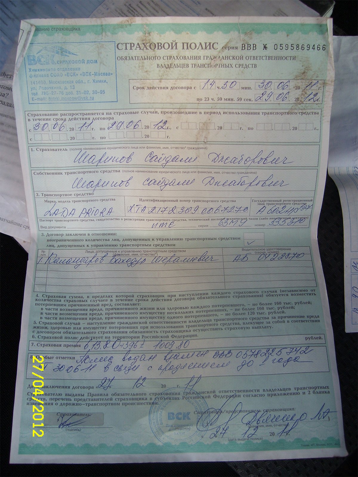Дело №1349595 машина БМВ 525i 1994г выпуска, моё имущество очень постродало от ДТП с застрахованным вами автомобилем, а я инвалид 2ой группы меня возит сын на этой машине и другой нет! А теперь и этой нет (так как она разбита и не едет) произошло всё ещё 21 апреля а 19 марта написали заявление к вам т.к. только получили все документы после группы разбора, а сегодня уже 25 МАЯ!!! А машина всё ещё разбита! Уже и эсперт приежал осматривал фотографировал, а тут выясняется что отказ т.к. полиса его не найдено в базе… а мне то что до этого не понимаю? Давайте мне базу вашу, сама поищу ну что за безобразие! Ладно встретелись с виновником взяли копии полиса отвезли в офис где и подовали заявление и документы, вроде как нашли сказали, потом сново приходится звонить постоянно самой так как нашли и ничего не происходит(деньги не приходят) Теперь опять выесняется что отказ какойто ну вы что там издеваитесь что ли??? ВСЕ документы есть полис настоящий он у вас в филиале в химках куплен. Пишу вам полные данные полиса виновника ( Страховой полис ВВВ № 0595869466 такой и в справке о ДТП указан срок действия с 30.06.2011 по 29.06.2012! а теперь пишу что внизу написано в полисе в пункте 8 «особые отметки» ПОЛИС ВЫДАН ВЗАМЕН ввв № 0578225742 ОТ 30.06.11 В СВЯЗИ С ПРОДЛЕНИЕМ ДО 1 ГОДА) Дата заключения договора 27.12.2011г) Это я вам ещё раз написала всё и копии все есть включая чеки по олате. А теперь жду ответа ПОЧЕМУ не возмещаете??? Ну я и так знаю что там денег мало, машина старенькая пробег большой, ну заплатите не издевайтесь над человеком! Или сами теперь меня возите!