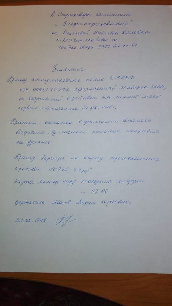 Здравствуйте! Я сегодня 21.08.2018 г. оформила полис на сайте Альфа-страхование, оплатила его, но напечатав увидела ошибку в фамилии второго водителя. Полис действует с 22.08.2018 г. В личном кабинете не получилось исправить ошибку в фамилии! Прошу полис аннулировать и вернуть уплаченные средства на карту, с которой производилась оплата. Очень плохо, что в личном кабинете нельзя вносить изменения!!!