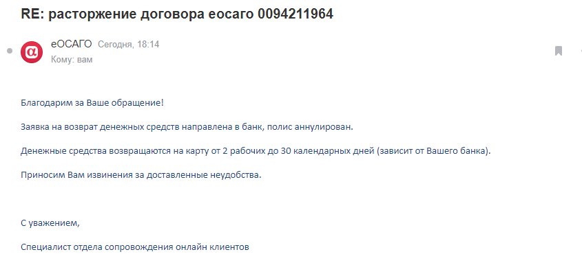 Здравствуйте. 25.08 оформил еОсаго через ЛК на сайте Альфастрахование ХХХ 0094211964. Полис должен был вступить в силу 10.09, но так получилось, что я продал автомобиль. Я позвонил 09.09 оператору и мне было предложено написать заявление и отправить его на почтовый адрес eosago@alfastrah.ru, что тут же было мною сделано. С тех пор уже прошла неделя, а от страховой компании ни ответа, ни привета. Никаких писем с уведомлением о принятии заявки, ничего. Да, оператор предупредила, что заявки рассматривают 10 дней, но тогда присылали бы хоть какое-то уведомление о том, что моё письмо принято в работу. А то сижу, жду, надеюсь на возврат средств, а моя заявка, может, даже не прочитана, а сроки для полного возврата средств уже упущены.