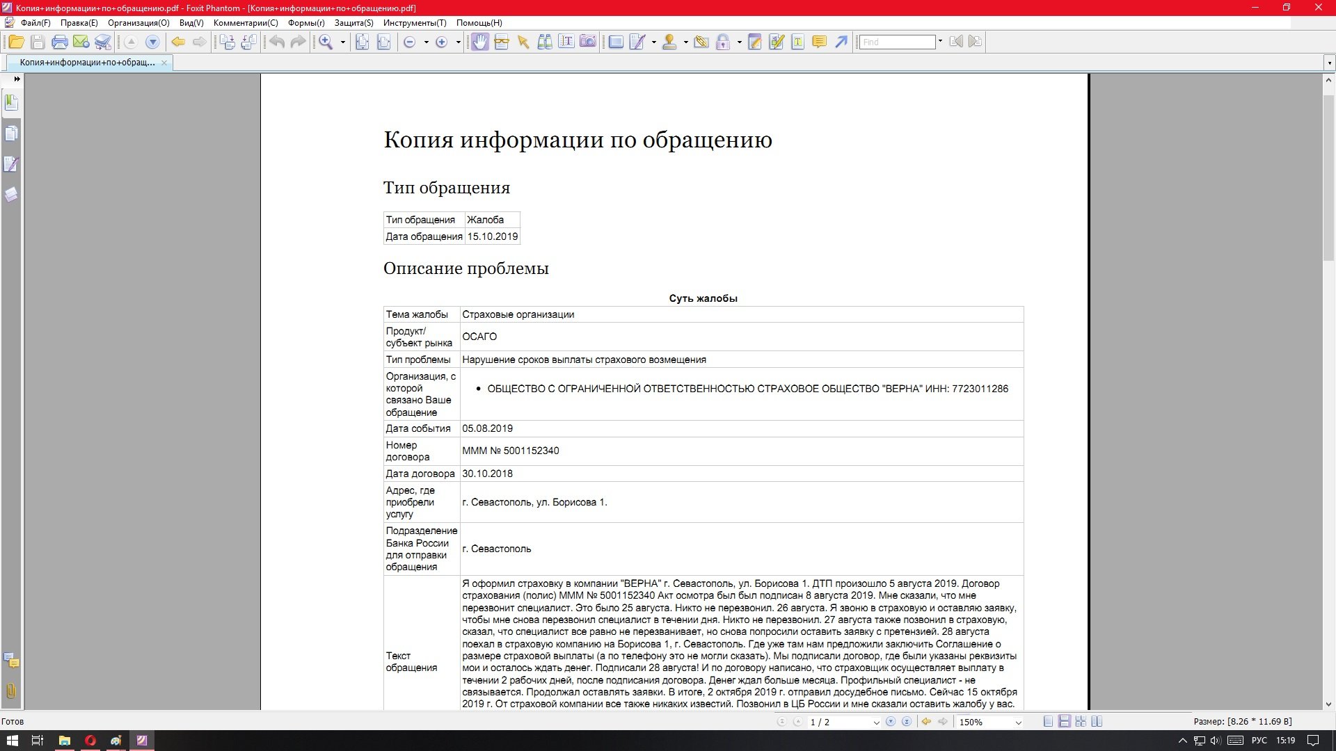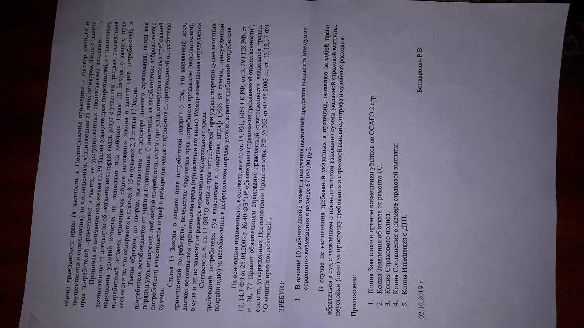 Отправлена жалоба в РСА 19.10.2019г.Следующая жалоба будет направлена в СУД и будете оплачивать в полном объеме.