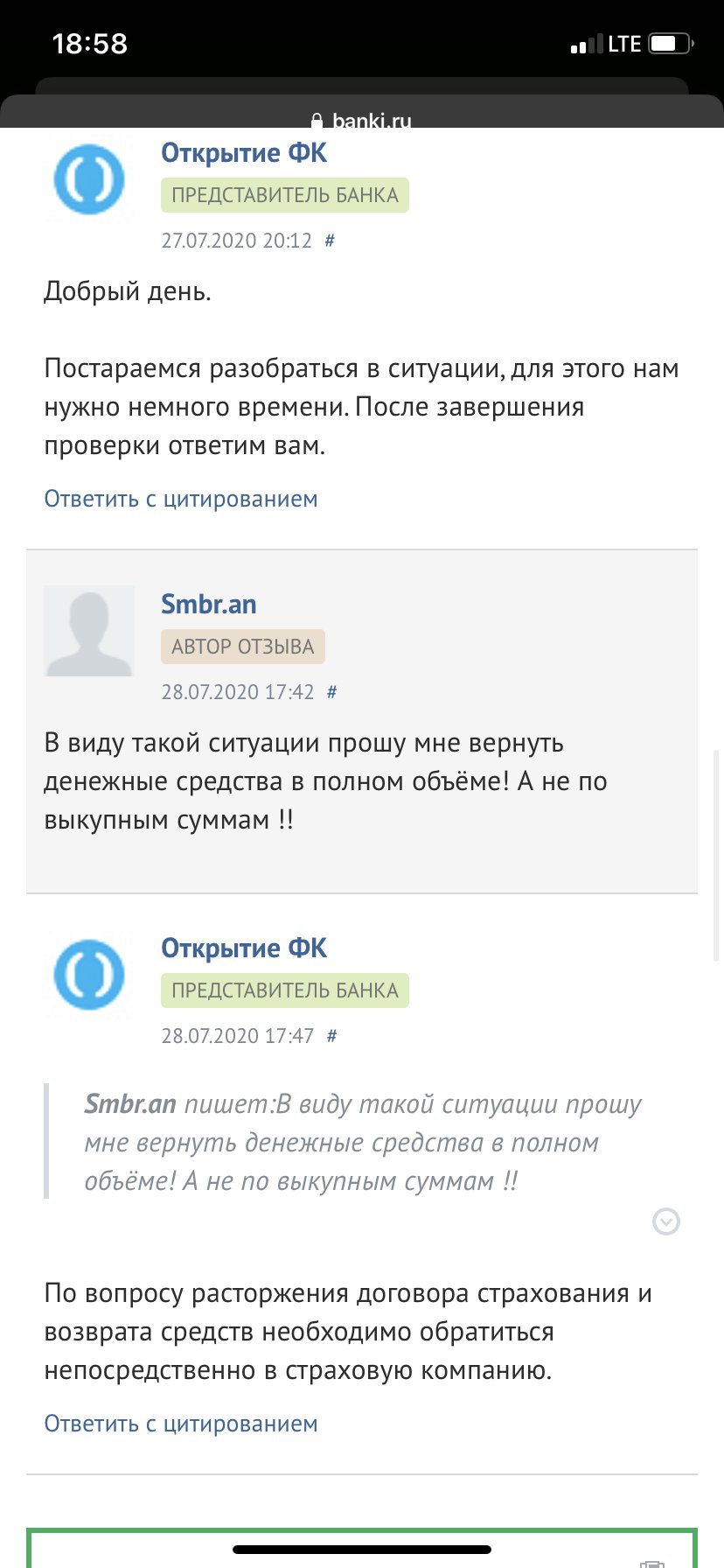 Прошу со стороны страховой компании вернуть мне денежные средства в родном объёме! Разве вы не прочитали, что обманным путём меня вынудили! Теперь я должна ещё и забирать с потерями, а вы ими пользовались два года! Банк от меня в очередной раз открестился! Прикладываю фото комментариев на отзыв на банк