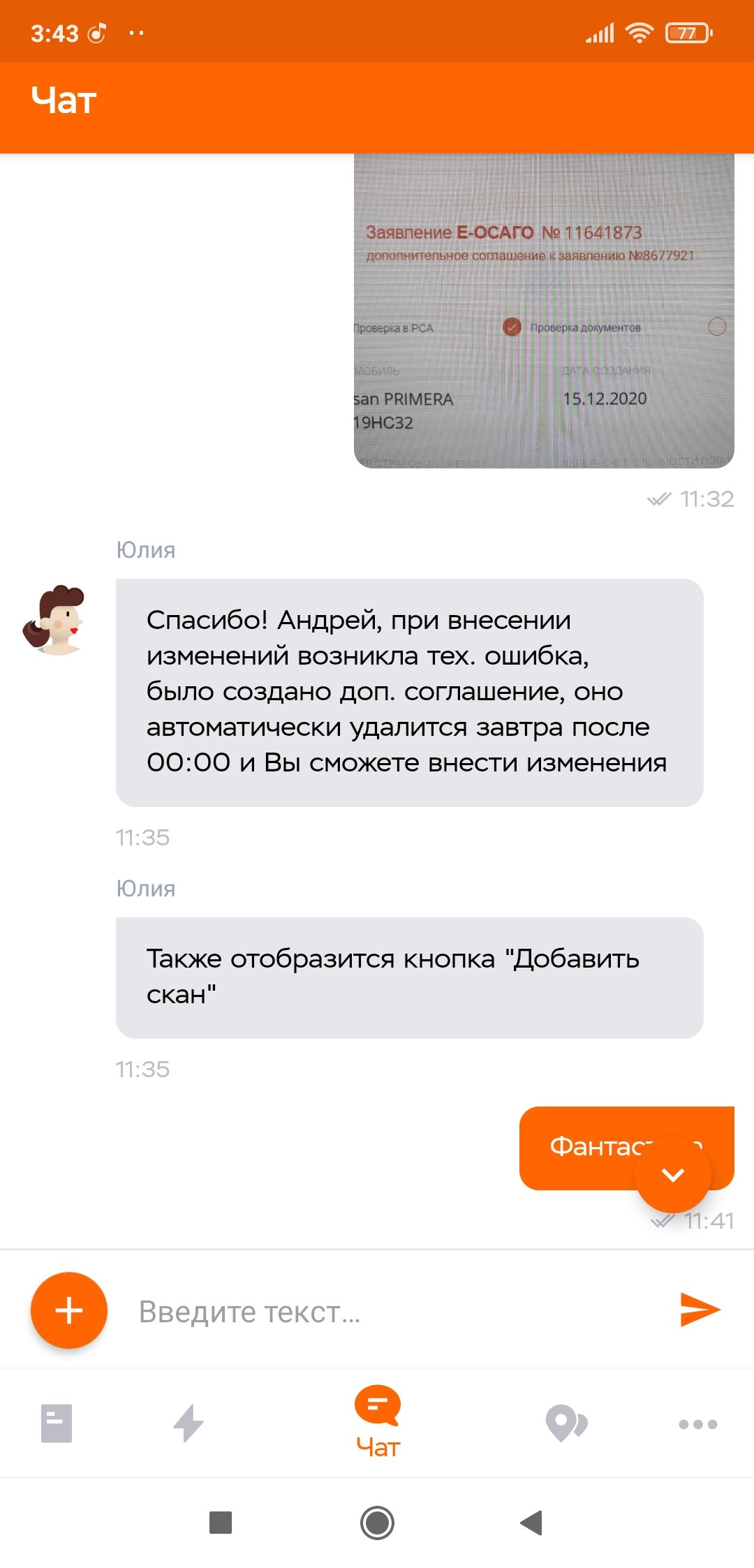Был заключен договор Полис Е-ОСАГО ХХХ 0150759755 сроком на 4 месяца, возникла необходимость продления периода пользования еще на 3 месяца, все попытки сделать это в электронном виде не увенчались успехом, необходимо загрузить сканы документов но не сайт не оф приложение не позволяют это сделать(отсутствует кнопка загрузки), обращения в службу поддержки ни к чему не привели, переводят обращения в брянский офис а те предлагают приехать и оформить не в электронном виде
