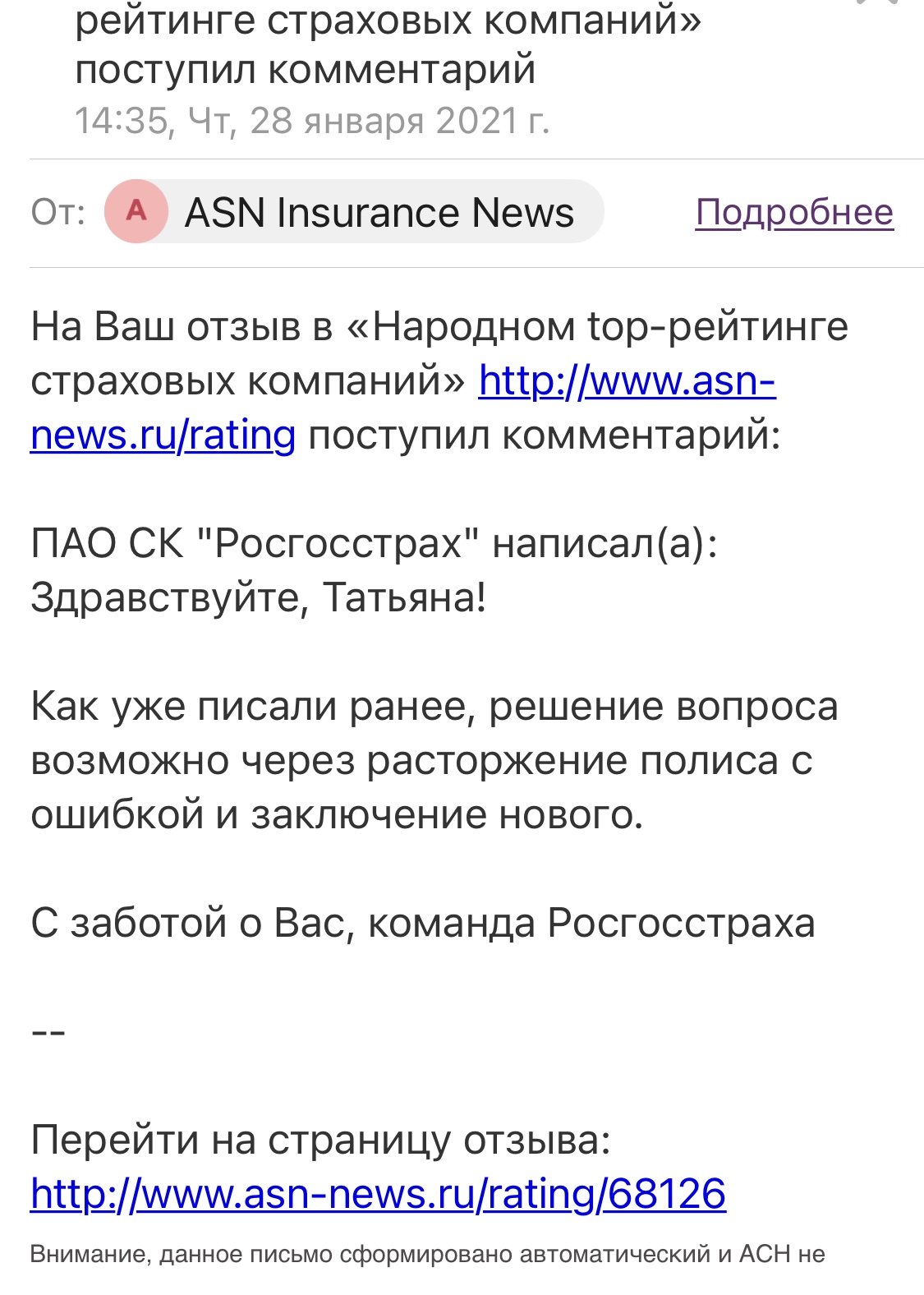 Оформили электронный полис ОСАГО 15.01.2021. Увидели ошибку в фамилии страхователя, она же собственник и водитель. 19.01.2021 обратились в офис РГС в г.Салават, ул. Космонавтов 48 б, написали заявление с просьбой исправить опечатку, приложили все копии документов! Через 1,5 часа позвонили и сказали не исправят, т.к. делали не у них. Зарегистрировала обращение на сайте РГС, звоню каждый день на горячую линию, говорят что в любом офисе можно исправить! Как Вас понять? Пишу сюда второй отзыв уже! На почту выслала вам все документы, и описала суть проблемы! Куда еще мне написать?