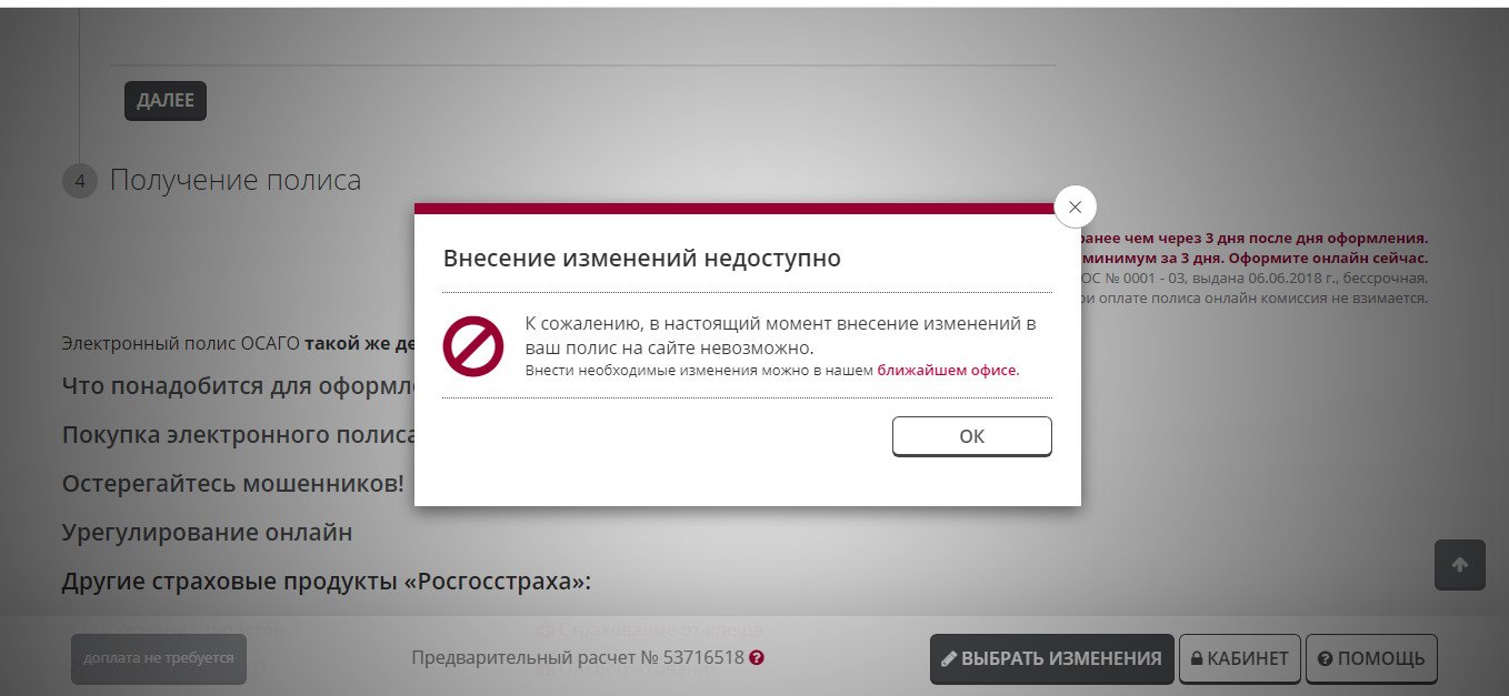 Здравствуйте, полис оформлен в Росгосстрахе, вступил в силу с 27.02.2021, потребовалось вписать второго водителя, после внесения данных водителя вылазит сообщение, В ДАННОЕ ВРЕМЯ ВНЕСЕНИЕ ИЗМЕНЕНИЙ НЕВОЗМОЖНО, ОБРАТИТЕСЬ В БЛИЖАЙШИЙ ОФИС РОСГОССТРАХ, но ближайший офис находится в 265 километрах от места моего проживания. Почему нет возможности внесения изменений электронно? Как вписать водителя?
