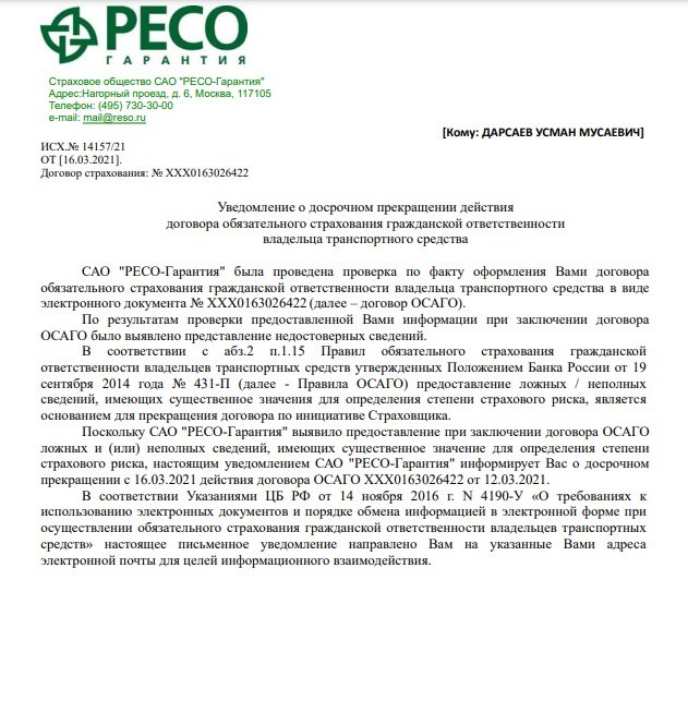 Мы готовы предоставить основания досрочного прекращения в одностороннем порядке договора ОСАГО ХХХ0163026422 ЦБ РФ, Прокуратуре, куда Вы направили жалобу.