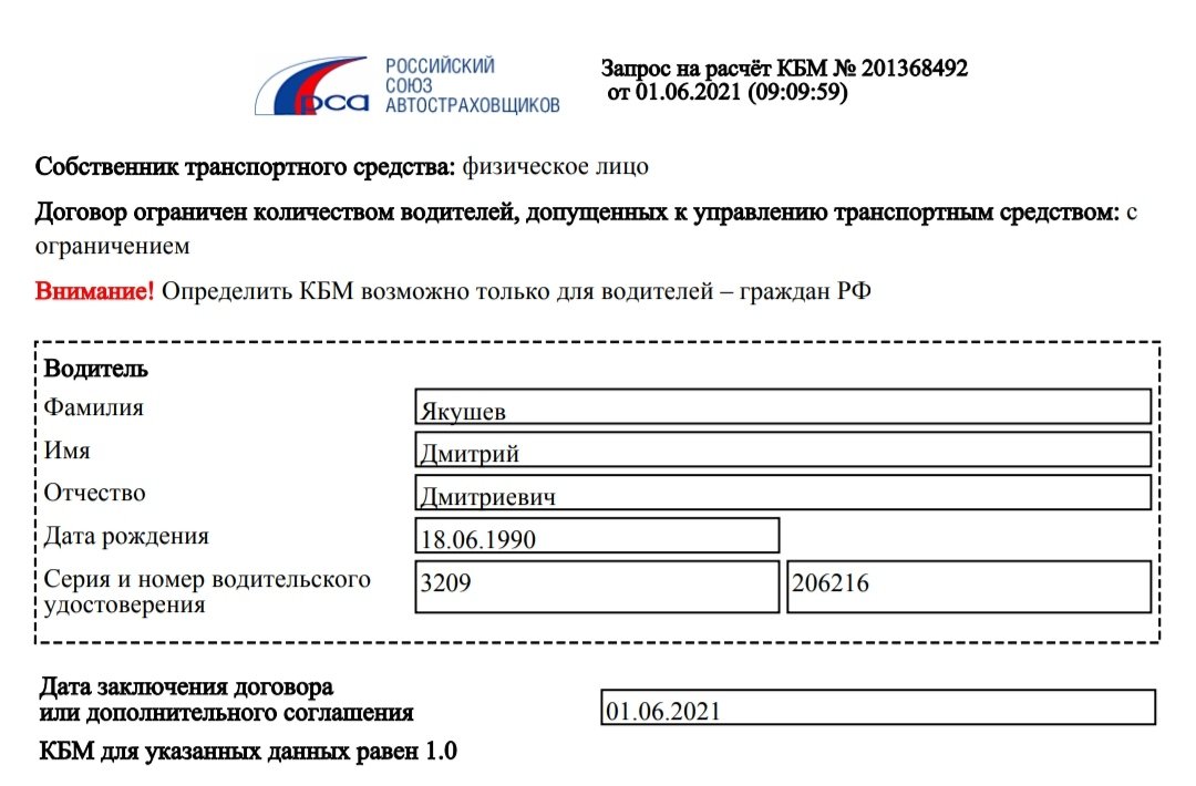 «Был организован запрос КБМ+ в АИС РСА № 6611084. От РСА получено значение КБМ 0,9»