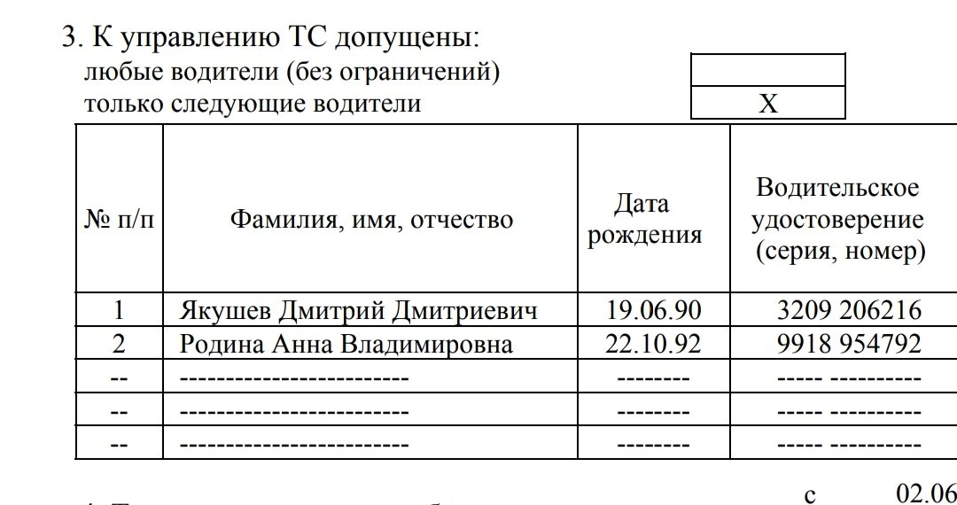 Увидеть это Вы можете в графе 3. К управлению ТС допущены: