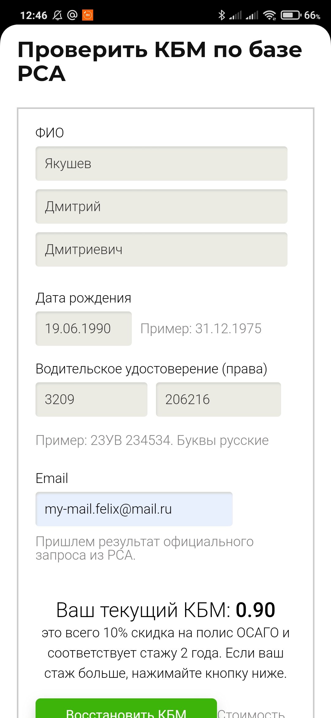 Поясним, что Вами при оформлении полиса ОСАГО в нашей компании дата рождения была указана как 19.06.1990. При проверке информации по данной дате на сайте РСА КБМ указывается в размере 0,9.