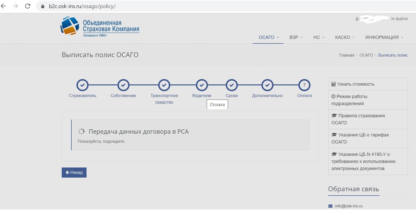 Вид: Первоначальный ОСАГО (АО «ОСК») Отправка договора в СК2 22.08.21 — 21.08.22