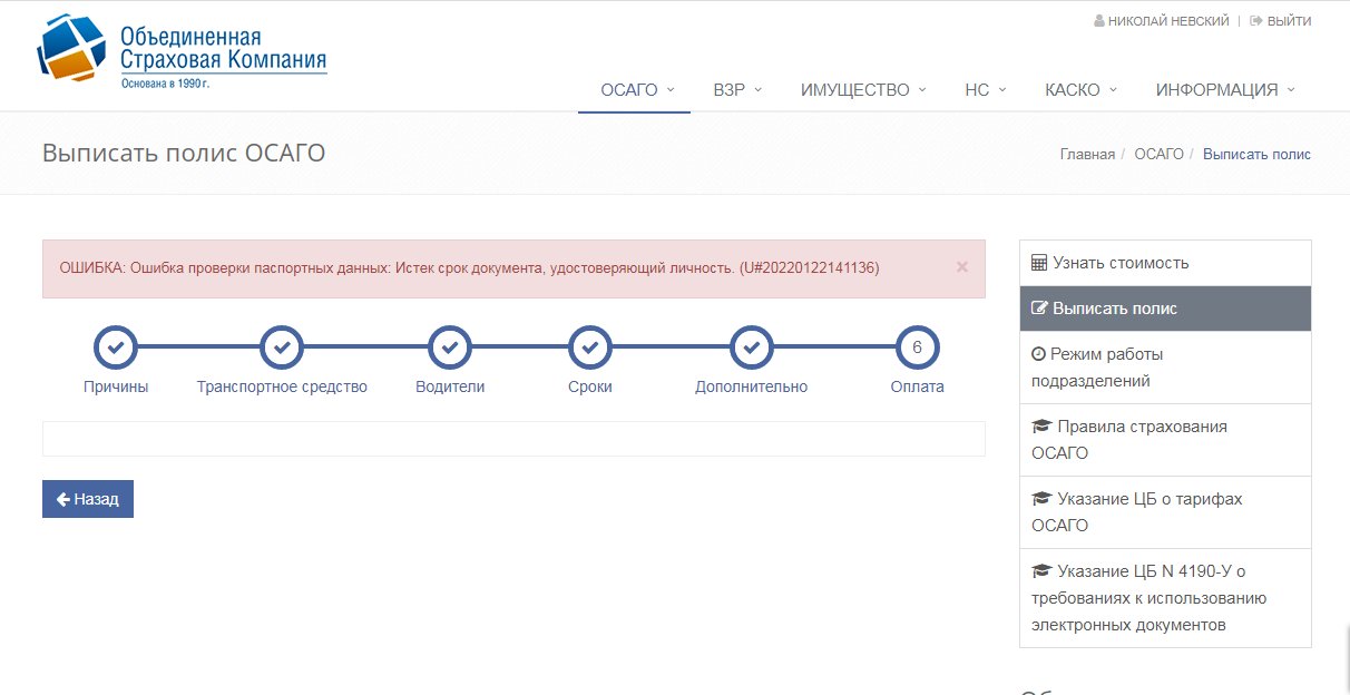 Очень прошу Вас помочь во внесении изменений, а именно пытаюсь добавить период использования ТС ещё на 3 месяца, выдаю ошибку — «ОШИБКА: Ошибка проверки паспортных данных: Истек срок документа, удостоверяющий личность. (U#20220122141136)»