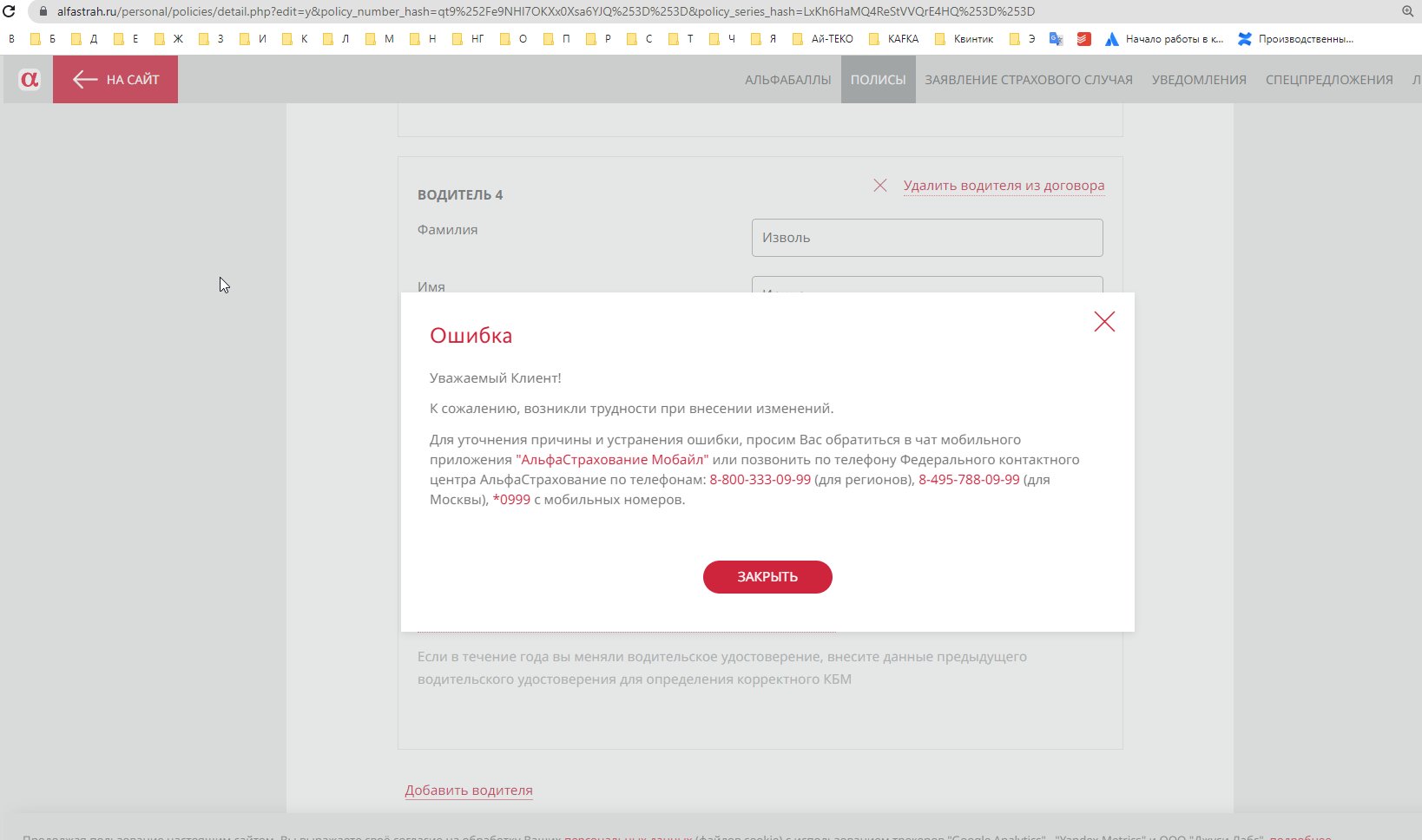 При попытке внести любое изменения в полис ОСАГО в личном кабинете Альфастрахования выходит ошибка «возникли трудности при внесении изменений, обратитесь в чат». Обратился в чат, ни чем не помогли.