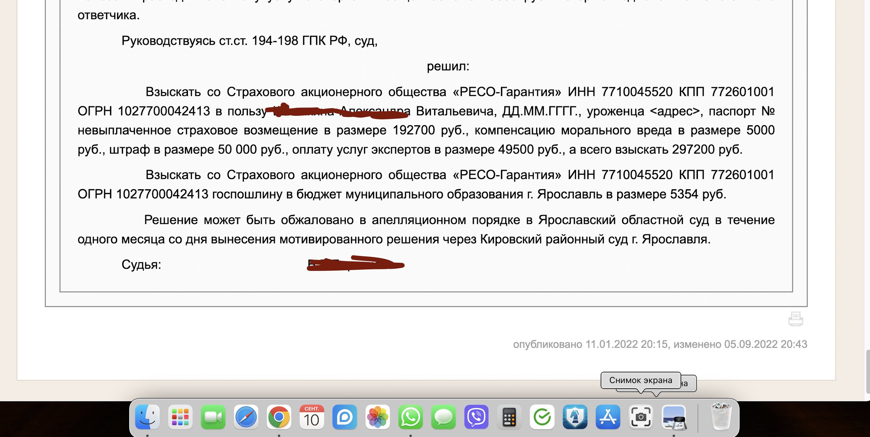 Судебное решение. решил: Взыскать со Страхового акционерного общества «РЕСО-Гарантия» ИНН 7710045520 КПП 772601001 ОГРН 1027700042413 в пользу Александра Витальевича, ДД.ММ.ГГГГ., уроженца <адрес>, паспорт № невыплаченное страховое возмещение в размере 192700 руб., компенсацию морального вреда в размере 5000 руб., штраф в размере 50 000 руб., оплату услуг экспертов в размере 49500 руб., а всего взыскать 297200 Взыскать со Страхового акционерного общества «РЕСО-Гарантия» ИНН 7710045520 КПП 772601001 ОГРН 1027700042413 госпошлину в бюджет муниципального образования г. Ярославль в размере 5354 руб. Понято, что они подадут апелляцию, но мне и лучше, фара не хило подорожала будут платить по новой цене тогда.