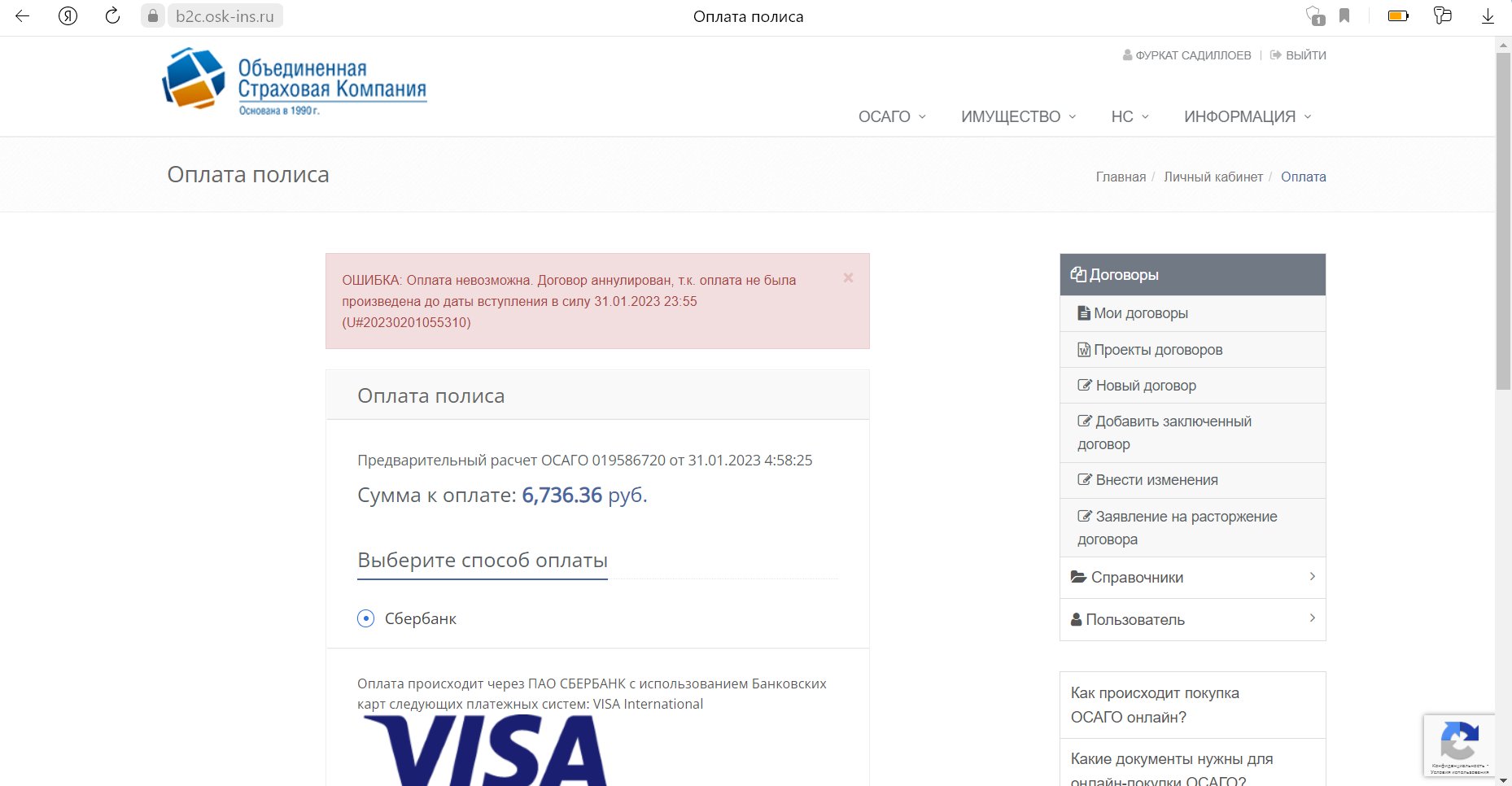 Вид: Первоначальный ОСАГО (АО «ОСК») Ошибка 31.01.23 — 30.01.24