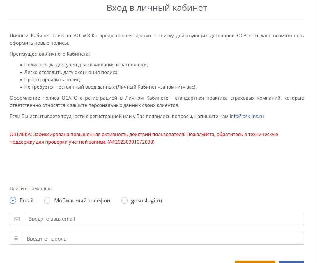 Я уже пожалел, что застраховал авто у вас! Мало того полис 4 суток оформлял поддержка вечно абонент не абонент. 1 февраля с горем попалам оплатил. 27.02.23 я попытался зайти в свой личный кабинет, на что у меня появилась ошибка ОШИБКА: Зафиксирована повышенная активность действий пользователя! Пожалуйста, обратитесь в техническую поддержку для проверки учетной записи. (A#20230227040446). А вы в курсе вообще, что заходил я туда, когда оформил полис то есть 01.02.23, какая активность?! Прошу принять меры! Мне нужно вписать водителя, почта ваша молчит, чат который на сайте, только представляюсь сразу исчезает. Вы там не оборзели ли?!