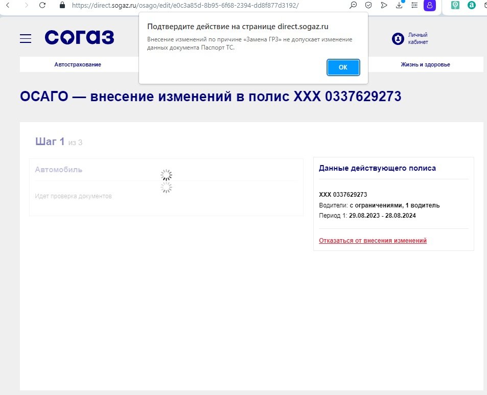 Добрый день, купили автомобиль, при постановки на учет была заменена ПТС так как страницы все были заполнены. А так же замена госномера и новая СОРТС. Решили внести данные в полис осаго ХХХ 0337629273.Зашла в личный кабинет, нажала редактировать из выпадающего списка причина изменения, смена собственника, смена цель использования, и замена ГРЗ. Выбрала ГРЗ, в поле документ ТС выбран документ Паспорт ТС и в поля вношу данные новой птс и новый госномер при сохранении выдает ошибку не допускается изменение данных документа ПТС. Обратилась в поддержку обращение №1-58100486249, описала ошибку, запросили скрин. Итог едьте в офис за 220 км чтоб, внести документ. Так же нет возможности внести сортс в полис, поле документ ТС заблокировано. Кажется простейшая ситуация изменились документы предоставила страховой, внести не могут.