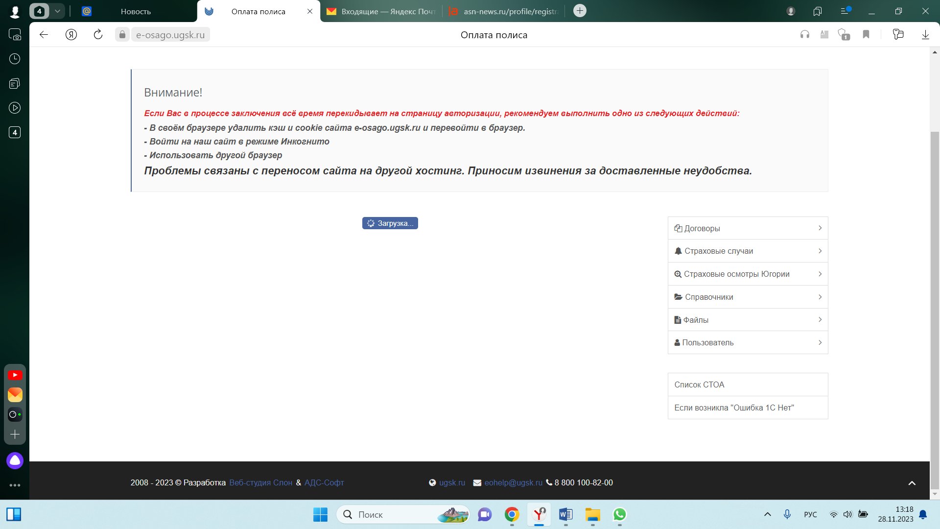 Обращаем Ваше внимание, что в процессе внесения изменений в полис участвуют несколько информационных систем, поэтому при неработоспособности одной из них могут возникать ошибки оформления или оплаты. С нашей стороны сбоев зарегистрировано не было.